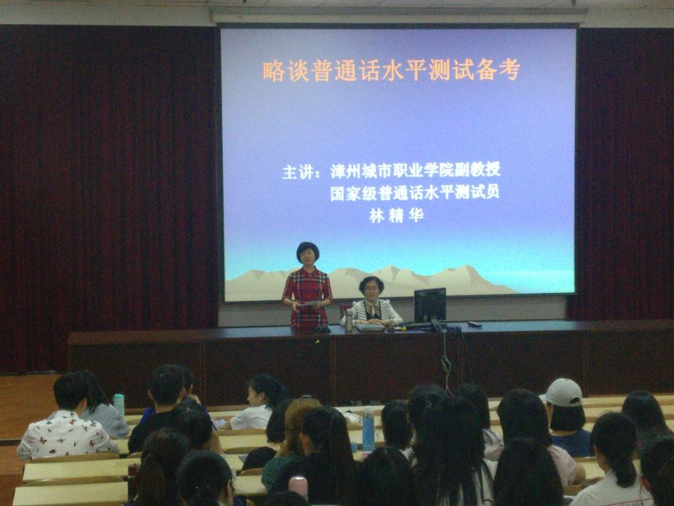 为了帮助我院学生刚好的迎接普通话水平测试,4月2日晚,我系借漳城院讲坛的机会邀请到了原普通话水平测试员林精华老师为学生讲解普通话考试备考的一些技巧。学院四百多名学生参加了此次讲座。