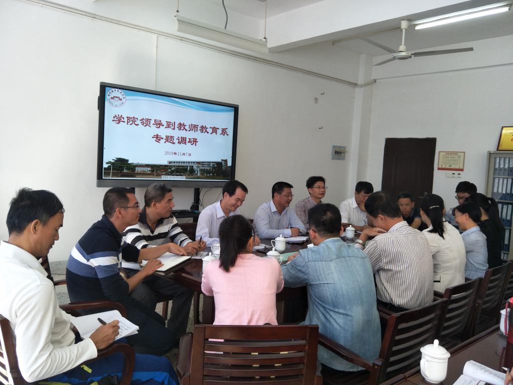 2019年11月7日上午,院长刘惠河、副院长林良海、副院长郑文平、教务处长林三睦、后勤处长曾顺和等到教师教育系调研语文教育、科学教育、体育教育三个2019年新增的国控专业办学情况。教师教育系书记蔡文艺、主任杨丽英、三个新增专业带头人及全体行政人员参加了调研会。