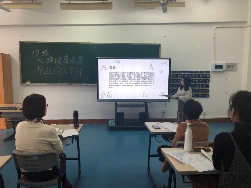 2019年12月18日下午,我系17级心理健康教育专业在致用楼602教室举行毕业论文答辩会。参加此次答辩会的有苏娟娟、方奕琪、林冰、周勤、于林老师。全体同学都到场聆听答辩同学的汇报。