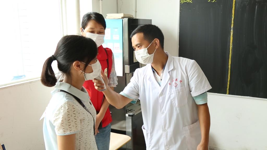 模拟进入教室前学生体温异常,现场协助测体温工作人员带学生到临时观察区,休息几分钟再用水银温度计进一步检测,并了解其身体状况,确认体温正常后,允许学生进入教室上课。
