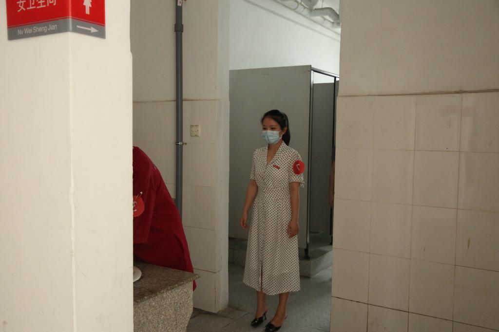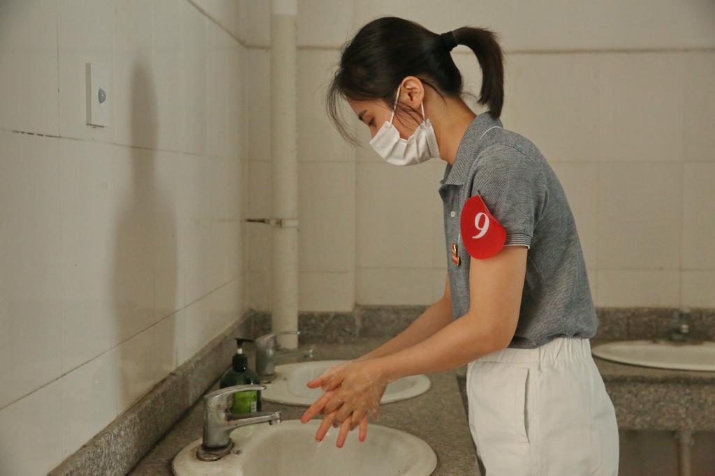 下课期间,上卫生间的同学按要求保持1米以上距离前往,方便后用洗手液洗手,再按规定返回教室。