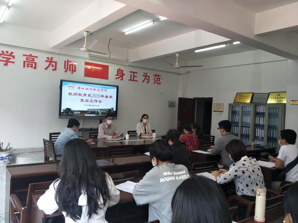 4月29日上午,教师教育系在系会议室召开2020年春季复学工作专题会,会议由系主任杨丽英主持,系党总支书记蔡文艺、各专业带头人(负责人)、各教研室主任、实训室主任、全体辅导员及行政人员参加了会议。