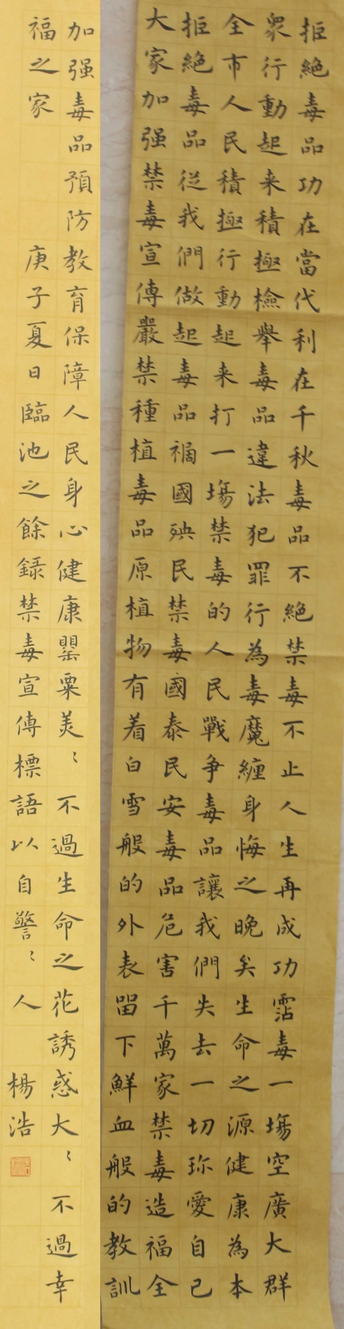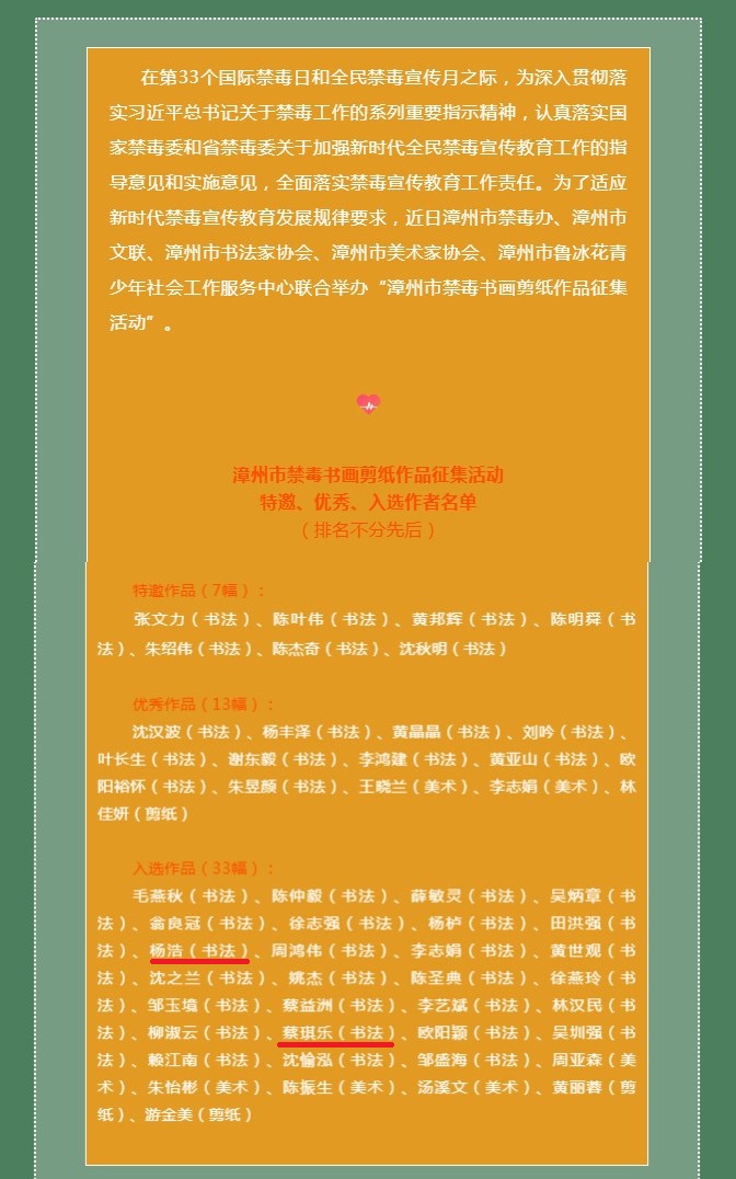近日,漳州市禁毒办、漳州市文联、漳州市书法家协会、漳州市美术家协会、漳州市鲁冰花青少年社会工作服务中心联合举办“漳州市禁毒书画剪纸作品征集活动”,由我系罗觉华老师指导的小学教育专业公费师范男生蔡淇乐、杨浩两位学生的书法作品成功入选,喜获佳绩。