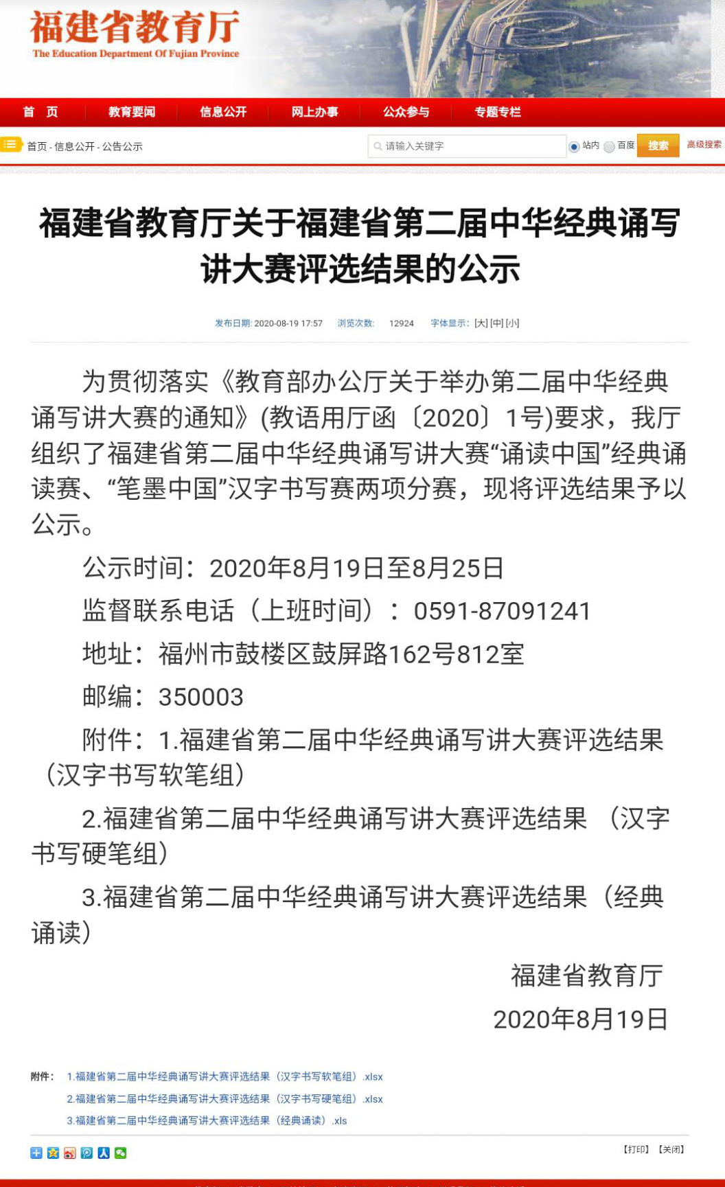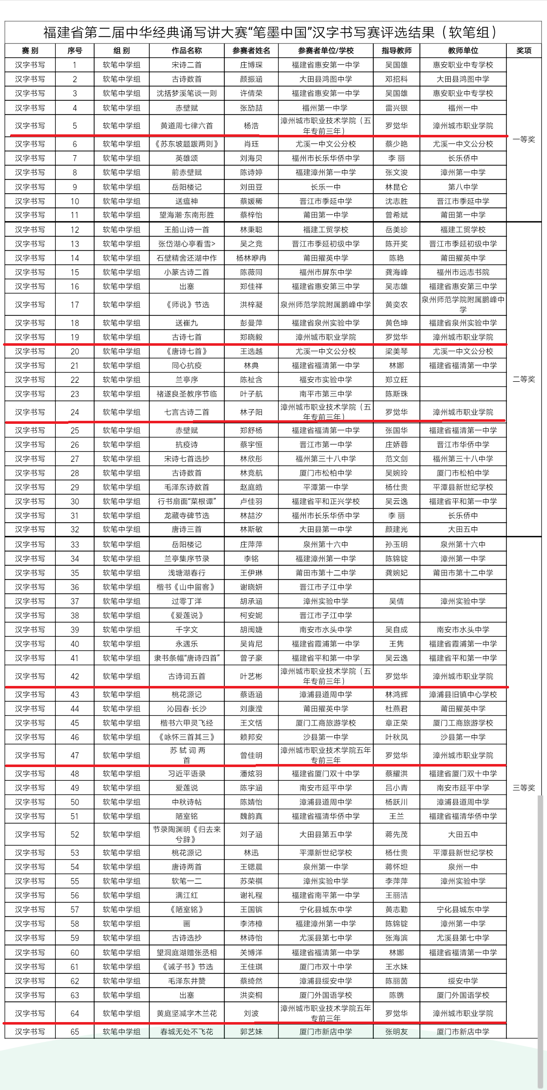 雅言传承文明,经典浸润人生。由福建省教育厅主办的福建省第二届中华经典诵写讲大赛“笔墨中国”汉字书写比赛现场选拔赛于8月3日在莆田市举行。在学院领导的支持下,我院教师教育系罗觉华老师指导的6位五年专学生,由我院刘云鹏老师带队前往莆田市参加现场比赛。经过大赛评委会多次评选,比赛结果日前公布,我院6位五年专学生在激烈角逐中全部获奖,取得了骄人的成绩。小教171(五专)杨浩同学荣获一等奖,小教191(五专)郑晓毅、小教183(五专)林子阳同学荣获二等奖,小教182(五专)叶艺彬、小教172(五专)曾佳明、小教171(五专)刘波同学荣获三等奖。