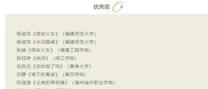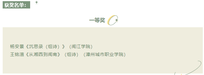 本次大赛面向福建省内25岁以下在校大学生,限定作品体裁为诗歌、小说、散文及剧本,主题自拟。大赛共收到17所高校640篇作品,经福建省内作协专家和高校教师代表组成的专家组评审,最终共有87篇作品获奖。我院教师教育系语文教育专业王铭渲同学的作品《从湘西到闽南》(组诗)荣获诗歌组一等奖,阮滢滢同学的作品《父亲的草药铺》荣获散文组优秀奖。