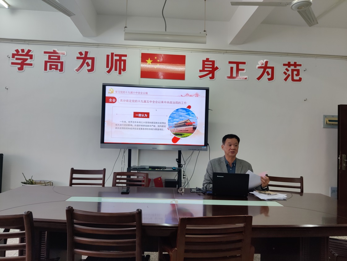 蔡文艺表示,党的十九届六中全会是我党在重要历史时间节点召开的一场具有全局性、历史性意义的重要会议,全会总结的党的百年奋斗历史经验,体现了全党的共同心声,鼓舞人心,令人振奋。在中国共产党成立一百周年的重要历史时刻,在党和人民胜利实现第一个百年奋斗目标、全面建成小康社会,正在向着全面建成社会主义现代化强国的第二个百年奋斗目标迈进的重大历史关头,党的十九届六中全会于11月8日至11日在北京胜利召开,这是我们政治生活中的一件大事,全体教职工应认真学习全会精神,深刻领会精神实质;坚持党的基本理论、基本路线、基本方略,增强“四个意识”,坚定“四个自信”,做到“两个维护”。