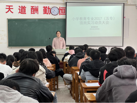 2021年12月28日,我系在博学楼621室召开2017级(五专)顶岗实习动员大会。教师教育系主任杨丽英、辅导员及全体顶岗实习的学生参加了本次动员会。会议由系主任杨丽英主持。