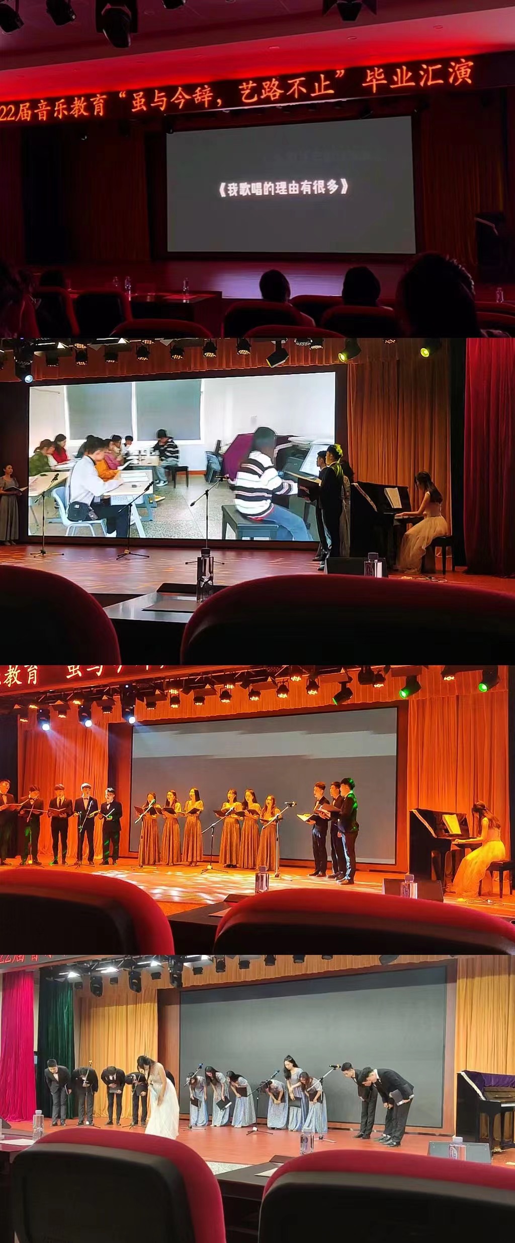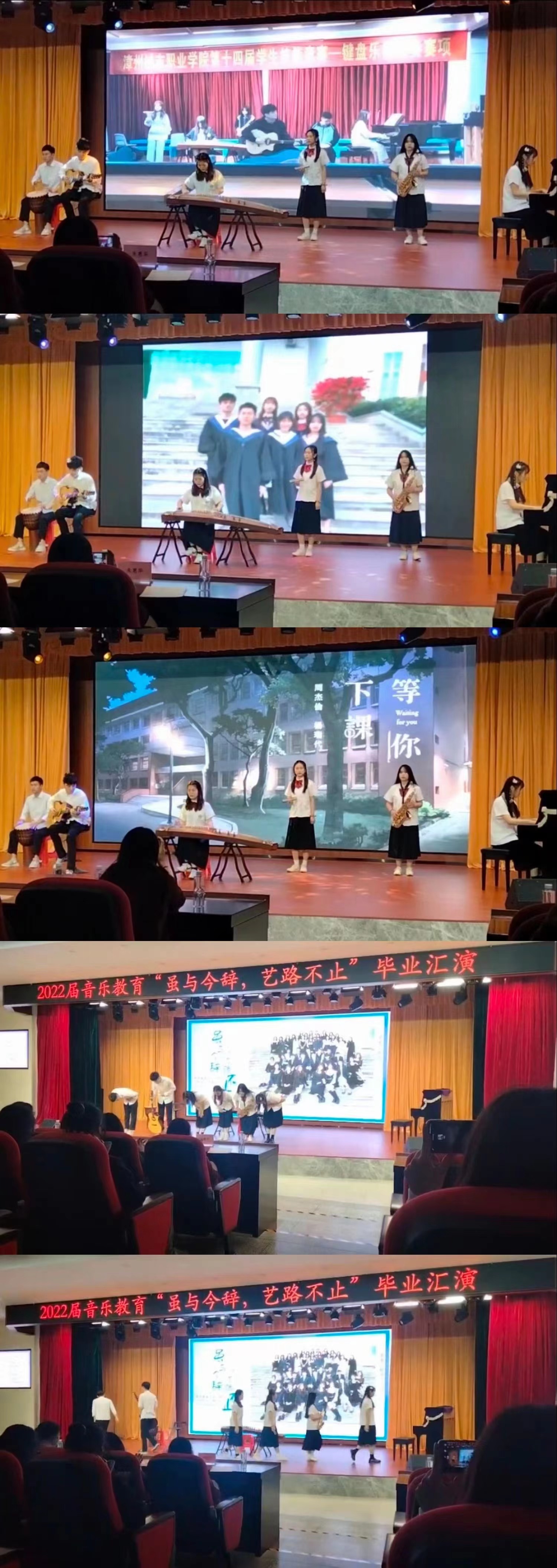 2021年12月28日晚上,漳州城市职业学院教师教育系音乐教育专业“虽与今辞,艺路不止”毕业汇演在院学术报告厅举行,本次音乐汇演邀请系领导、专业老师和本系的同学们来观看演出。整个演出过程气氛热烈,在场观众座无虚席,掌声不断。