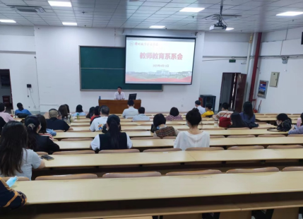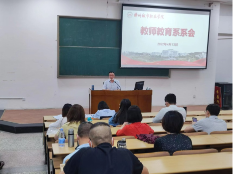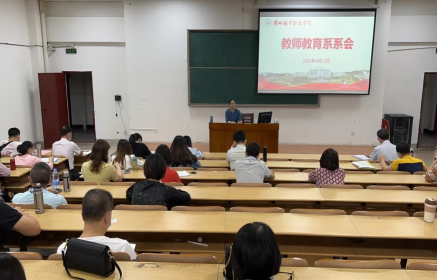 2022年4月13日下午,教师教育系在怀仁楼梯二召开全体教职工大会。系党总支书记蔡文艺、系主任杨丽英、副书记仲山民、副主任白碧慧及全体教职工参加了会议。