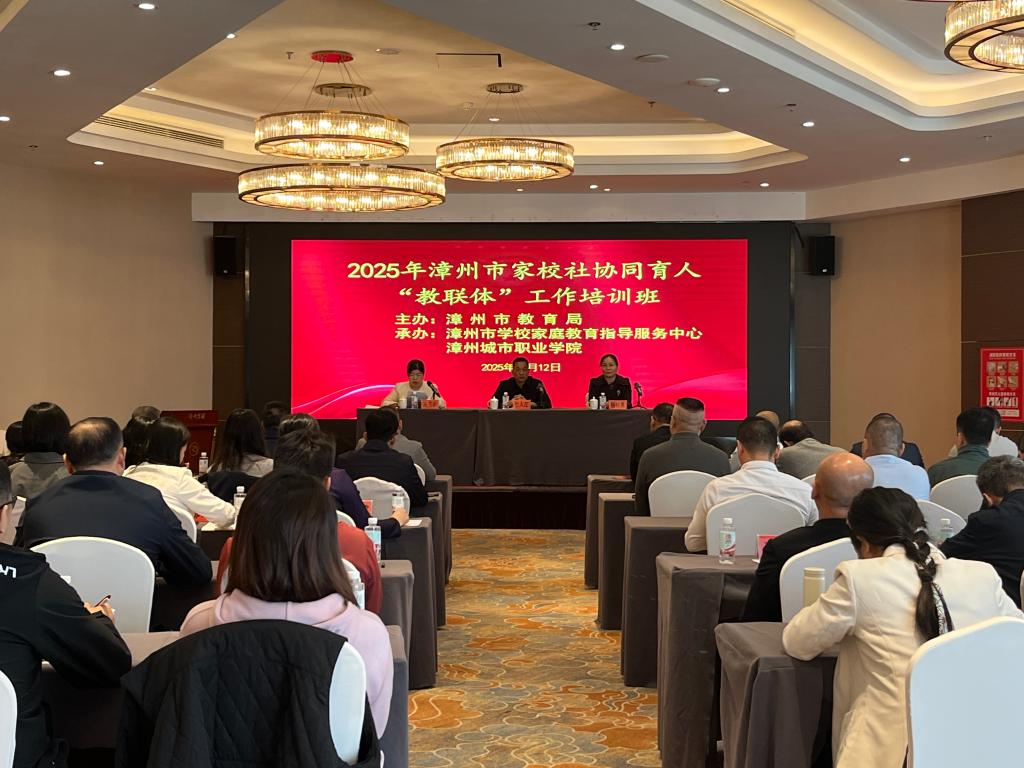 2025年12月12日,漳州市家校社协同育人“教联体”工作培训班正式开班。本次培训由漳州市教育局中心主办,漳州市学校家庭教育指导服务中心与漳州城市职业学院联合承办,旨在提升协同育人工作实效。漳州市教育局副局长杜人江、漳州城市职业学院教师教育学院院长杨丽英、漳州市教育局思政科科长陈月娇出席开班仪式。来自漳州各县(区)及市属学校的52名分管领导及业务负责人参加了本次线下集中培训。