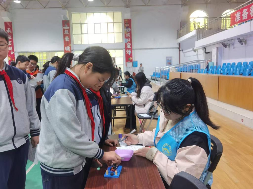 测评活动分别在胜利校区的小礼堂和腾飞校区的综合馆展开,六年级的测评活动共设“自制简易电动机”“观察纸火箭飞行高度与橡皮筋弹力大小”、“比较八颗行星距离太阳的远近”三个实验测评项目。每个项目由4名科学教育专业学生负责,依据预先制定的评分标准,对参加游园的小学生进行实验操作规范性、科学问题回答准确性等方面的综合评价,实现教学过程与评价过程有机融合。