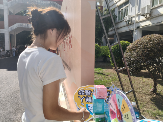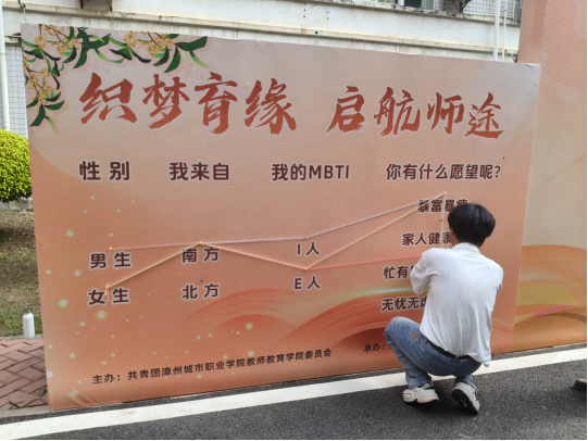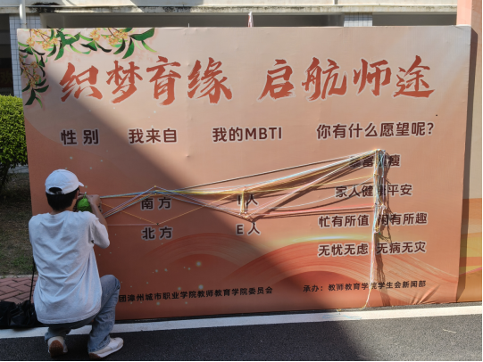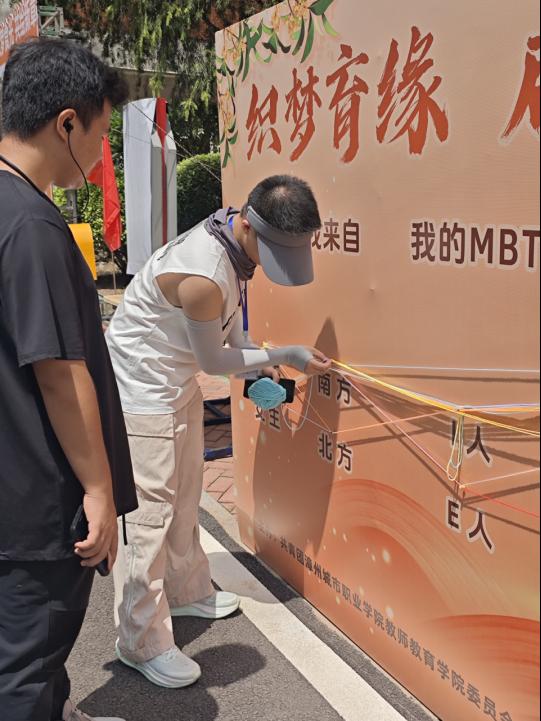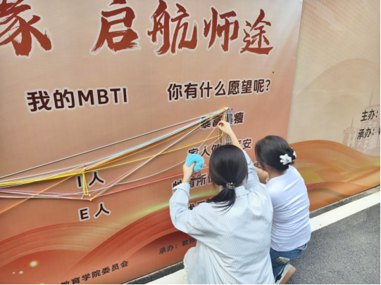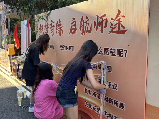 当天,教师教育学院还在迎新报到处推出“织梦育缘,启航师途”主题缠线签到活动,以创意互动方式欢迎2025级新生的到来。 活动现场设置了定制签到墙,新生可选择喜爱颜色的棉线,在钩钉间缠绕连接,共同“织就”属于集体的梦想画卷。