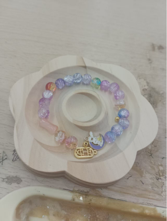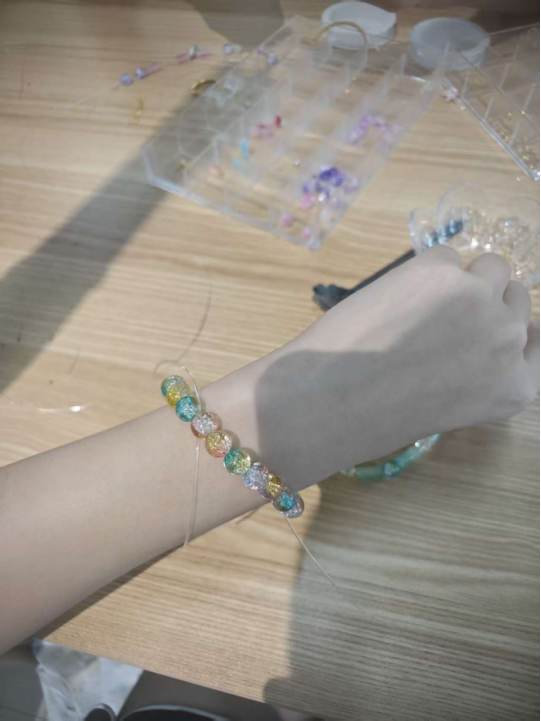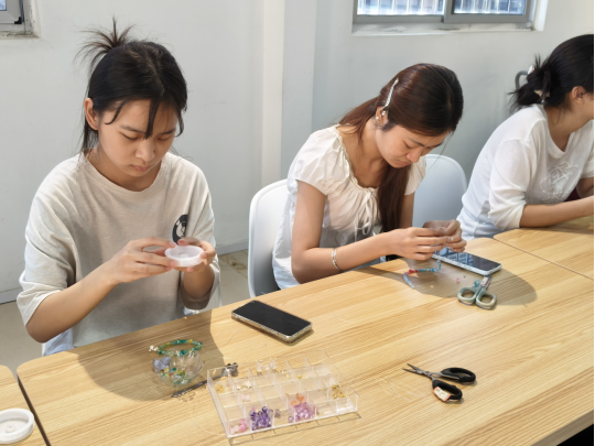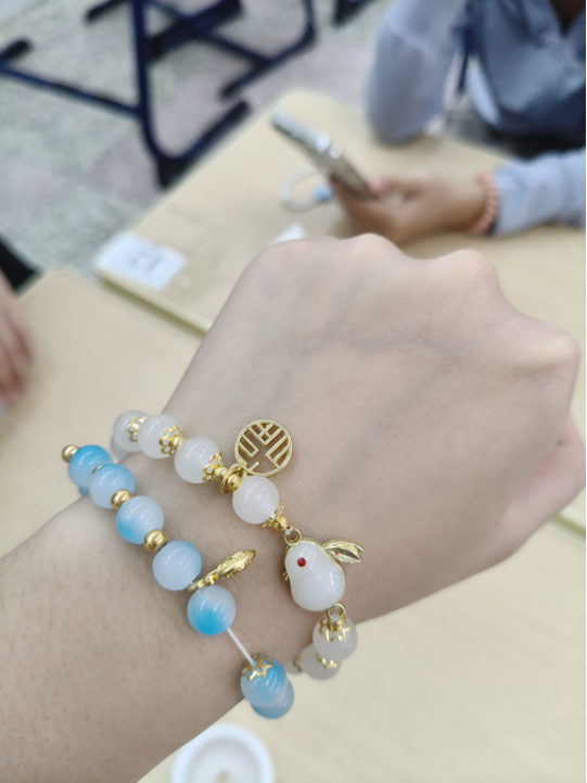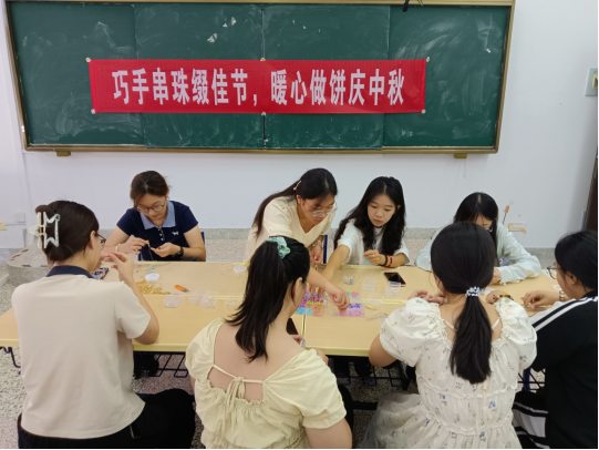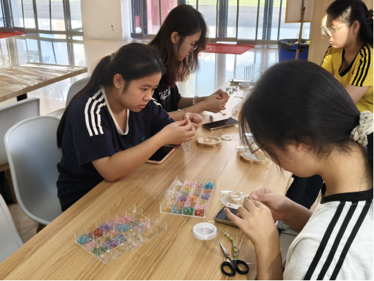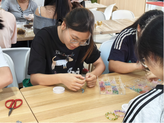 活动伊始,创意串珠DIY区域吸引了众多同学踊跃参与。桌上琳琅满目的各色珠子、晶莹剔透的水晶线和各式小配件,激起了学生们的无限创作灵感。在志愿者的耐心讲解下,大家自主创意,将一颗颗小巧的珠子在指尖穿梭、缠绕,逐渐幻化成精致的手链、雅致的挂饰或可爱的月饼造型小饰品。现场欢声笑语不断,大家相互交流配色心得,分享编织技巧,在专注与协作中,不仅放松了身心,更将一份份美好的中秋祝福编织进独一无二的作品里。