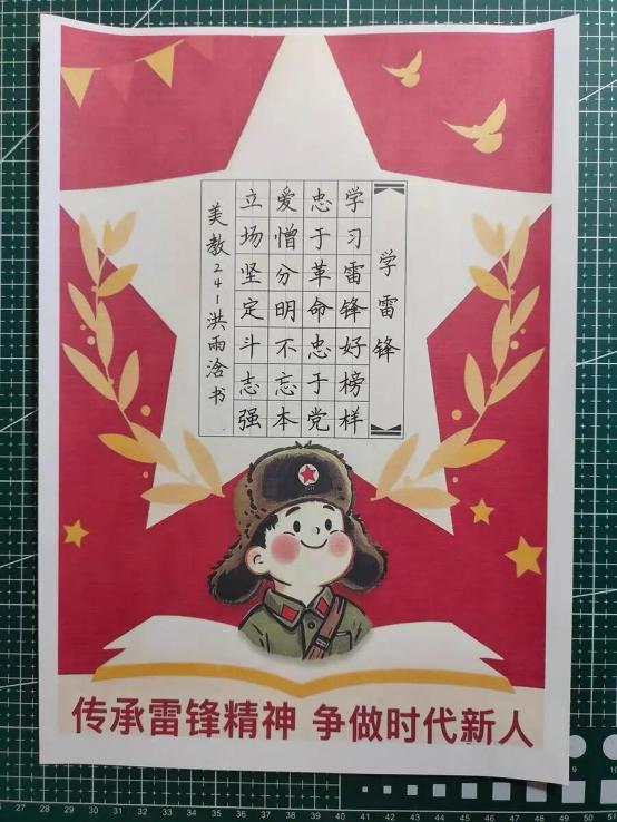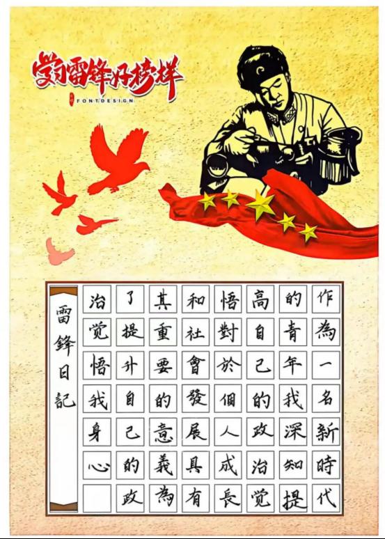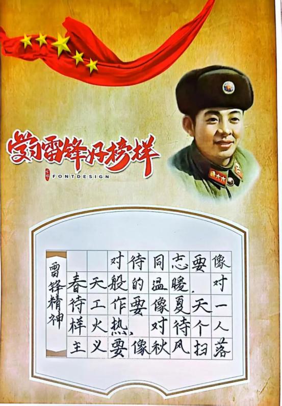 我临摹《学雷锋好榜样》主题作品,在书写雷锋日记中,体会到将个人成长融入社会发展的赤诚担当。作品中的雷锋形象、五星红旗与和平鸽,让我读懂奉献精神与家国情怀。此次临摹不仅是书法练习,更让我明白雷锋精神永不过时,激励我以点滴行动践行初心。