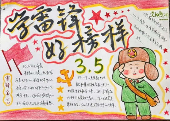 我以红黄色调、五角星和红旗创作“学雷锋 好榜样”手抄报,搭配卡通雷锋形象、名言与题词,突出3月5日榜样力量。作品寄托我对雷锋精神的理解,愿带动更多人践行温暖与担当。
