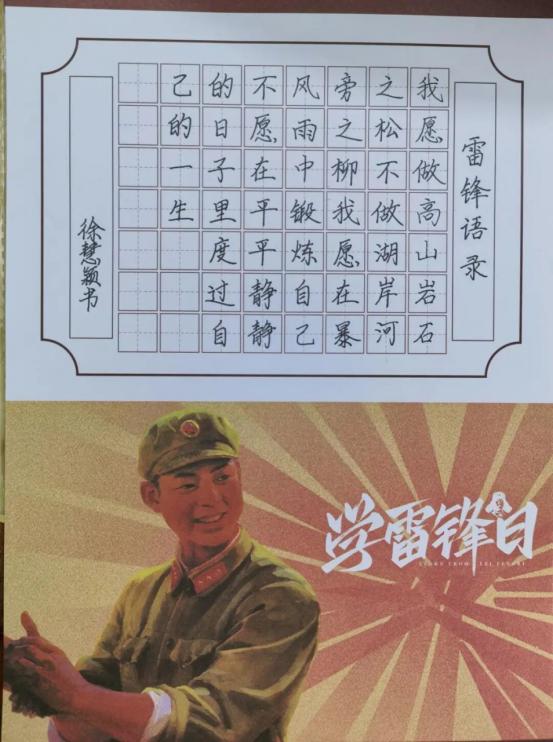 我临摹雷锋语录:“我愿做高山岩石之松,不做湖岸河旁之柳。我愿在暴风雨中锻炼自己,不愿在平平静静的日子里度过自己的一生。”书写中,我感悟到雷锋坚韧不拔、甘于奉献的精神。作为新时代青年,应不畏艰难、锤炼自我,勇担时代责任。