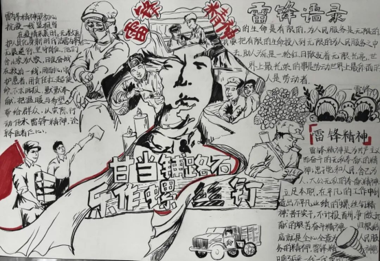 这幅作品以“甘当螺丝钉,乐作螺丝钉”为核心,将雷锋精神与抗疫医护人员的奉献相结合。画面通过雷锋服务群众、医护人员逆行坚守的场景与语录,展现新时代雷锋精神的传承与担当。