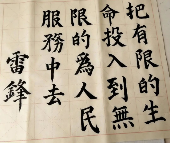 在临摹中,我深刻体会到雷锋精神的时代内涵:“爱憎分明”是坚守原则,“立场坚定”是信念支撑。每一笔都饱含敬意,提醒我以雷锋为标杆,践行奉献与担当,让红色力量在笔墨间传递、在心中扎根。