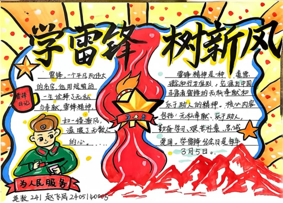 本幅“学雷锋 树新风”手抄报以火炬、五角星、雷锋形象等元素,传递奉献精神与时代内涵。作品融合红色庄重与活泼风格,展现新时代青年传承雷锋精神、践行文明新风的决心与敬意。