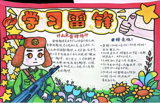 我以“学习雷锋”为主题设计手抄报,左侧Q版雷锋、向日葵与五角星,象征温暖向上;右侧梳理雷锋事迹与精神内涵,传递奉献实干的品质。色彩明快活泼,展现雷锋精神的时代价值,呼吁大家践行暖心善举。