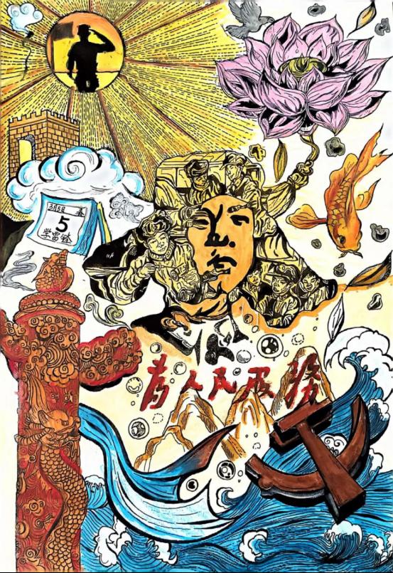 这幅画生动展现了雷锋精神的力量与温度。雷锋形象与“为人民服务”大字相映,战士们践行奉献,传递温暖力量。左侧华表与长城彰显民族风骨,右侧锦鲤莲花寓意高洁希望。旭日东升,象征雷锋精神如炬,在新时代薪火永续、照亮前路。