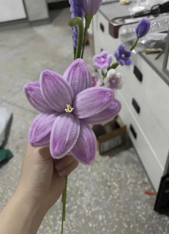 我用扭扭棒制作了这束紫色的手工花束,主花选用温柔的淡紫色,搭配深浅不一的小花,就像妈妈在我成长路上给予的温暖与力量。每一片花瓣都由我反复弯折、调整,希望能把这份细腻的心意融入其中。